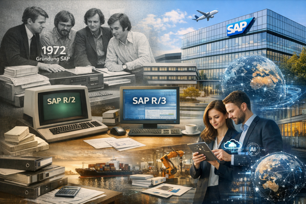 Am Anfang stand eine vergleichsweise einfache Idee: Geschäftsprozesse in Unternehmen nicht mehr isoliert, sondern in einem gemeinsamen System zu verwalten und das möglichst in Echtzeit. Was heute selbstverständlich erscheint, war Anfang der 1970er Jahre ein technischer und organisatorischer Umbruch. Die Geschichte des Softwarekonzerns SAP beginnt genau hier.